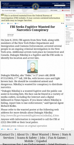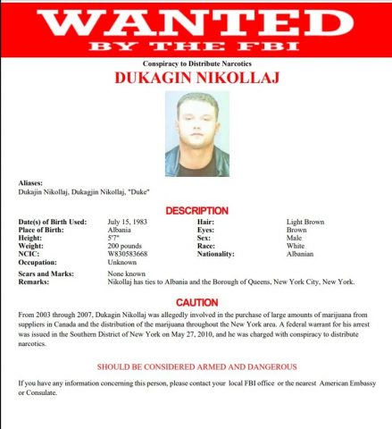 “Më 8 qershor 2010, agjentët e FBI-së nga Nju Jorku, së bashku me anëtarët e Departamentit të Policisë së Nju Jorkut dhe Emigracionit dhe Zbatimit të Doganave, arrestuan disa persona në një hetim penal në vazhdim në zonën e Nju Jorkut. Arrestime të tjera u bënë në Konektikat dhe Kanada. Dukagin Nikollaj është i arratisur dhe FBI kërkon të identifikojë vendndodhjen e tij dhe ta arrestojë”, thuhet në njoftimin e FBI-së.