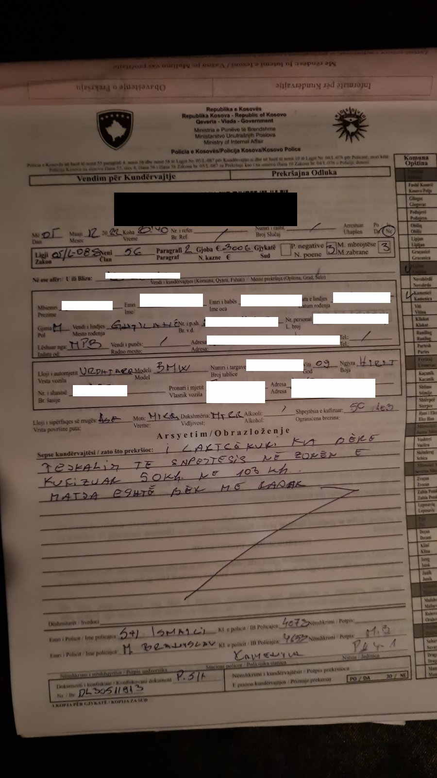Në këtë pikë të kontrollit ka hasur në një kundërvajtës i cili tejkalon në vijë të plotë me të cilat veprime rrezikon pjesëmarrësit e tjerë në komunikacion, tejkalim të cilin e bënë në zonën ku kufizimi i shpejtësisë është 50 km/h duke vozitur me shpejtësinë 103 km/h.