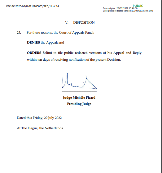 Paneli ka vendosur që Selimit t’i refuzohet në tërësi ankesa, dhe rrjedhimisht, atij i vazhdohet paraburgimi.