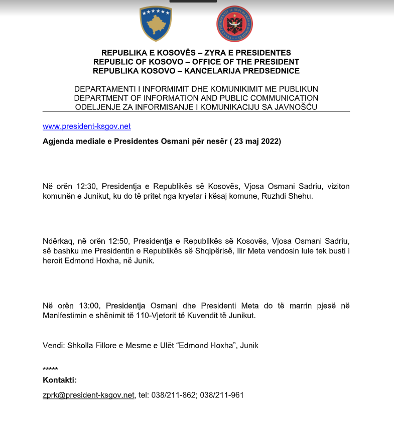 Në orën 13:00, Osmani dhe Meta do të marrin pjesë në Manifestimin e shënimit të 110-Vjetorit të Kuvendit të Junikut. /arbresh.info/