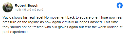 ‘Vuçiq tregon fytyrën e tij të vërtetë! Asnjë lëvizje përsëri në shesh. Shpresoj tani presion real mbi regjimin [në Serbi] pasi tani përsëri pothuajse të gjitha shpresat u prishën. Këtë herë ata nuk duhet të trajtohen përsëri me doreza mëndafshi, por të kenë frikë nga më e keqja duke parë përvojën e kaluar”, ka shkruar ai në Facebook./arbresh.info/