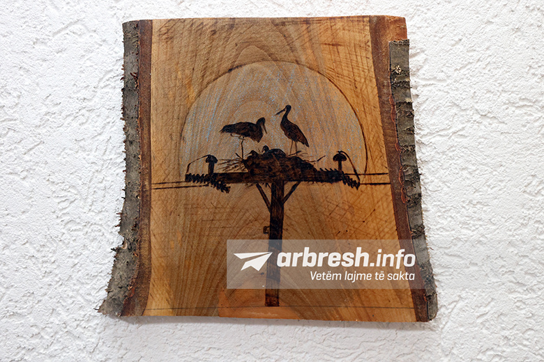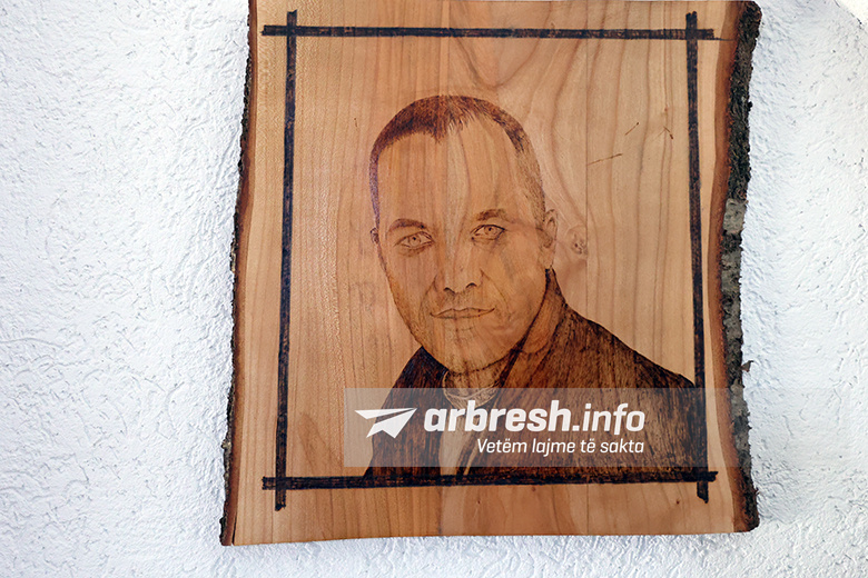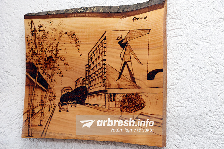 Një nga dhomat e shtëpisë së pensionistit, Xhemil Ismani nga Ferizaj, është e mbushur plotë me piktura e portrete të djegura mbi dru.