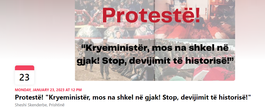 Të hënën e 23 janarit, është thirrur një protestë në sheshin Skenderbeu në Prishtinë, për shkak të deklaratave të kryeministrit Albin Kurti për politikanin e ndjerë serb, Olivier Ivanoviq, të cilin Kurti e përshkruajti si njeri të përkushtuar.