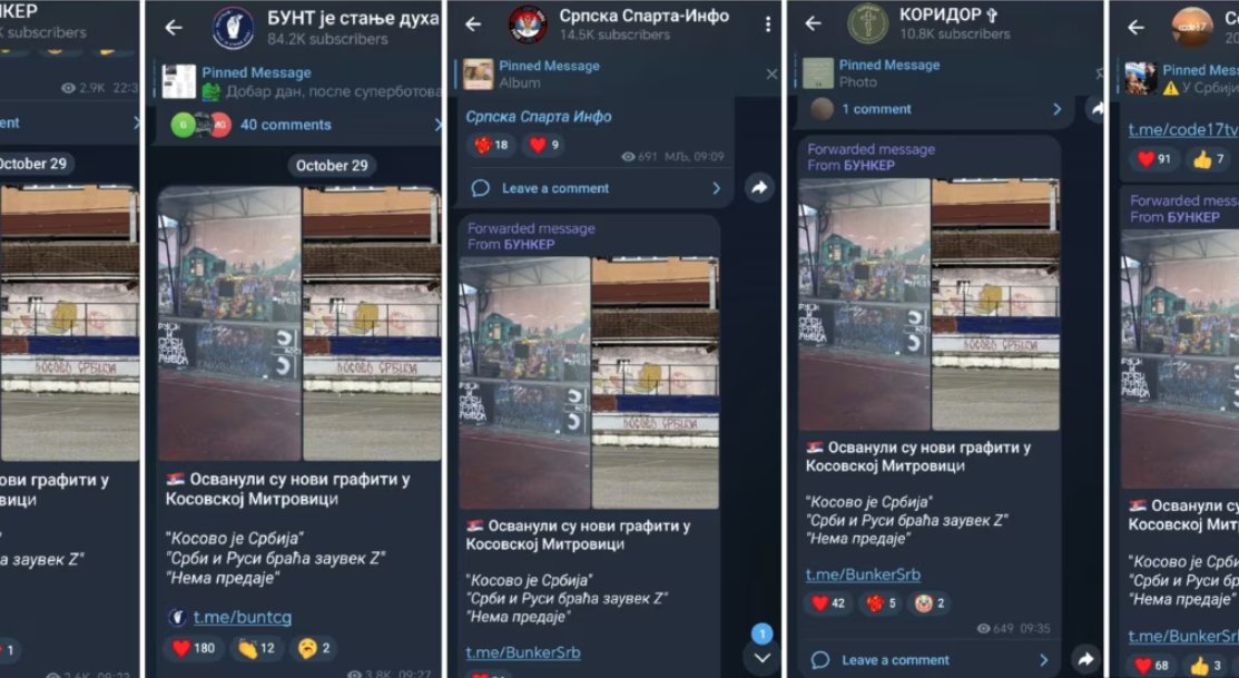 Kështu, më 29 tetor, kanali “Bunker” në Telegram njoftoi se në Mitrovicë të Veriut janë shfaqur grafite të reja: “Kosova është Serbi”, “Serbët dhe rusët janë vëllezër përgjithmonë Z”, “Nuk ka dorëzim”.