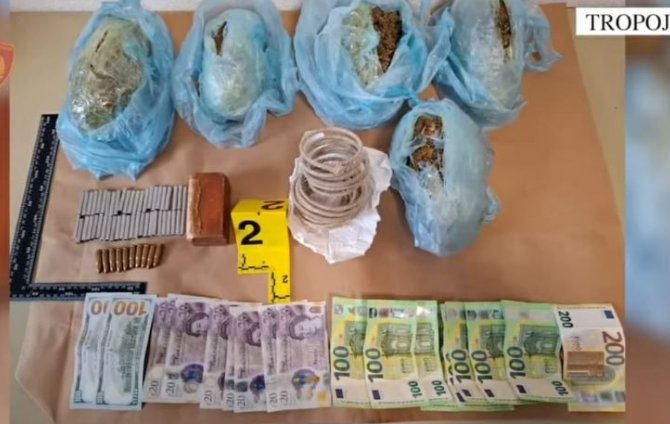 Sekuestrohen 1.2 kilogramë lëndë narkotike kanabis, 405 gram tritol, 51 kapsolla detonatore, 5 m fitil zjarrpërcjellës, municion luftarak, si dhe një sasi lekësh.