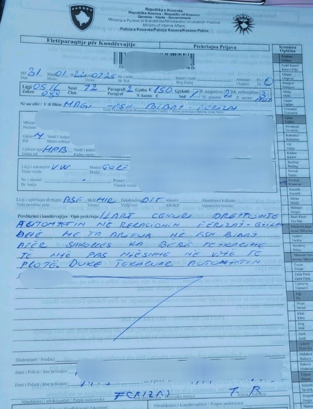 Në lidhje me këtë ndaj shoferit u shqiptua një gjobë sipas ligjit të komunikacionit rrugor , 150 euro, 2 pikë negative dhe 3 muaj heqje e patent shoferit.