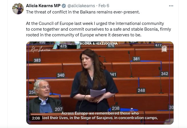 Përmes një postimi në platformën “X”, Kearns ka shpërndarë një pjesë nga fjalimi i saj i mbajtur në Këshillin e Evropës, ku ka kërkuar angazhim më të madh ndërkombëtar për stabilitetin e Bosnjë e Hercegovinës. Ajo ka theksuar se e ardhmja e këtij shteti duhet të jetë e lidhur ngushtë me Evropën.