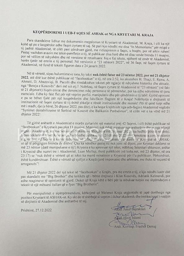 “Para skandaleve lidhur me dokumentin megaloman të Kryetarit të Akademisë, M. Kraja, i cili ka një kohë që po e keqpërdor edhe faqen zyrtare të saj. Së pari kjo ndodhi me disa “In Memoriame” për miqtë e tij jashtë Akademisë, të cilët pasi qëndruan gjatë, me ridizajnimin e faqes, u hoqën, por në arkiv ruhen! Pastaj vazhdon avazin me tekst-pamfletin e tij, të publikuar disa herë dhe në disa vende brenda 11 muajve, por në vëllim të ndryshëm dhe në versione të retushuara: hiq e fut tekste, njëherë në emër të Akademisë, herën tjetër në emrin e tij personal”, thuhet mes tjerash në këtë letër.