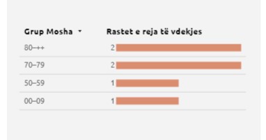 Po ashtu, sipas raportit viktima tjetër është një person i grup moshës 50-59 vjeç, dy të tjerë janë nga grup moshat 70-79 vjeç dhe dy të tjerë mbi moshën 80-vjeç.