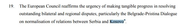 “Këshilli Evropian ripohon urgjencën për të bërë përparim të prekshëm në zgjidhjen e mosmarrëveshjeve të pazgjidhura dypalëshe dhe rajonale, veçanërisht Dialogun Beograd-Prishtinë për normalizimin e marrëdhënieve ndërmjet Serbisë dhe Kosovës*”, thuhet në pikën e 19-të.