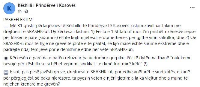 Pas pezullimit të grevës në arsim, Këshilli i Prindërve përmes një shkrimi në Facebook, ka reaguar duke thënë se pas pesë javësh greve, drejtuesit e SBAShK-ut, edhe anëtarët e sindikatës e kanë përgjegjësi ta pyesin vetën dhe njëri-tjetrin se a ia ka vlejtur dhe a mund të ndjehen krenarë me grevë?