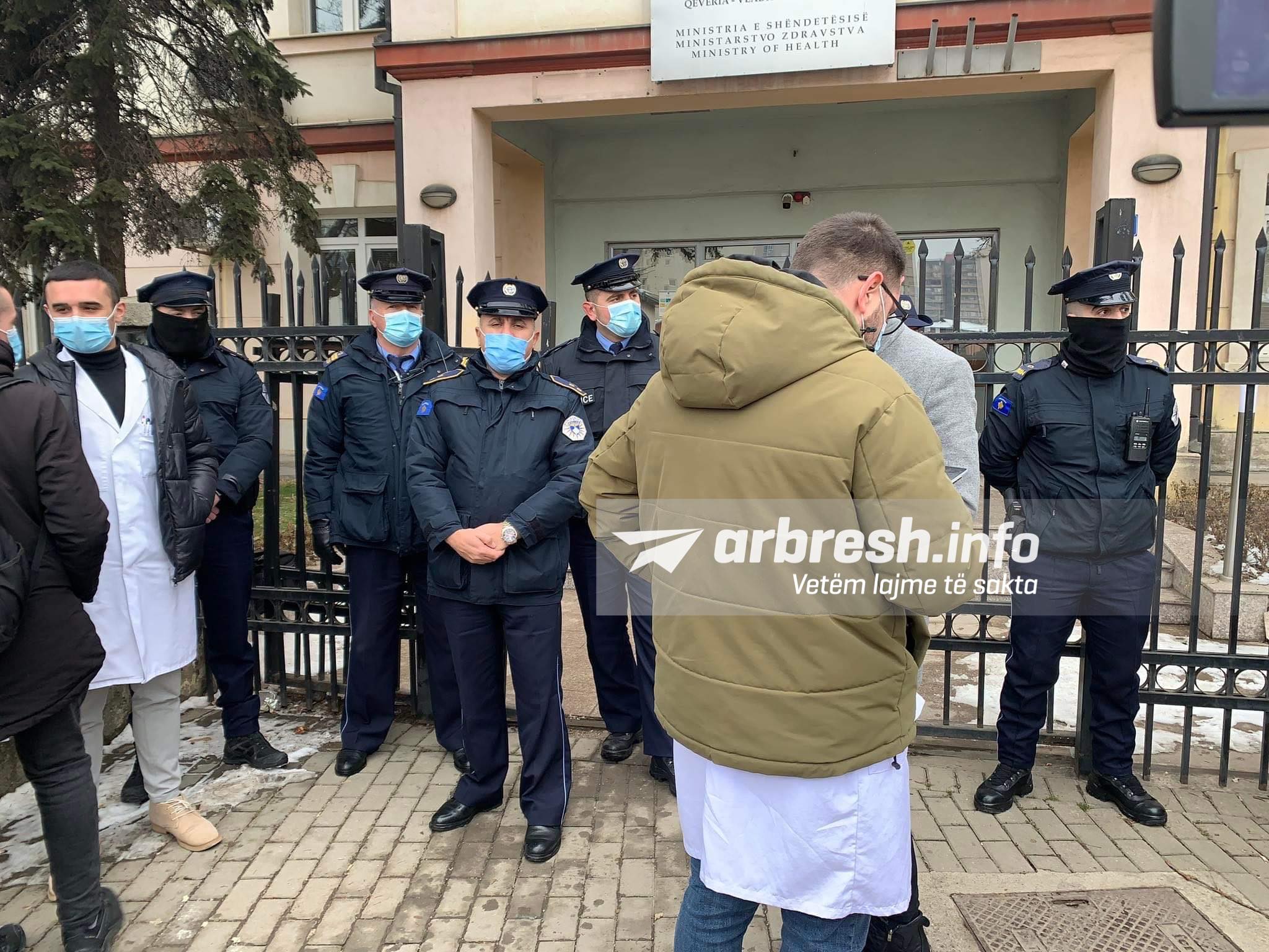 “Specializantët që 1 vit në rrugë”, “vlerësoni mjekët” ishin disa nga mbishkrimet që u vendosën në hyrje të këtij dikasteri.