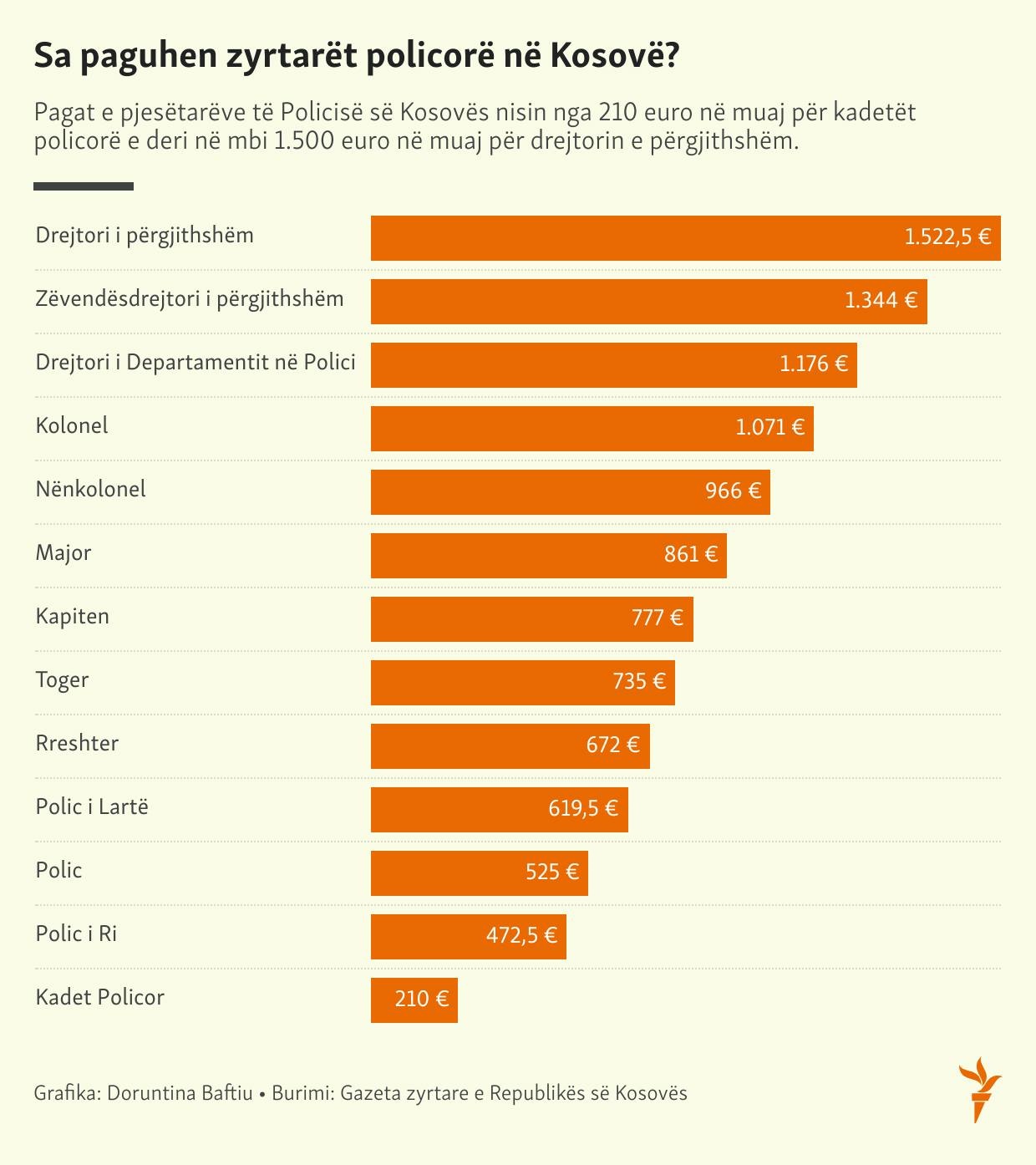 Radio Evropa e Lirë ka përgatitur një grafikë ku janë të publikuara pagat e zyrtarëve policorë.