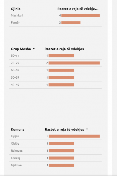 Një viktimë është i moshës 40-49 vjeçare nga Komuna e Ferizajt, një i moshës 50-59 vjeçare nga Rahoveci, një i moshës 60-69 vjeçare nga Lipjani, dy të moshës 70-79 vjeçare nga Lipjani dhe Gjakova dhe një mbi 80 vjeç.