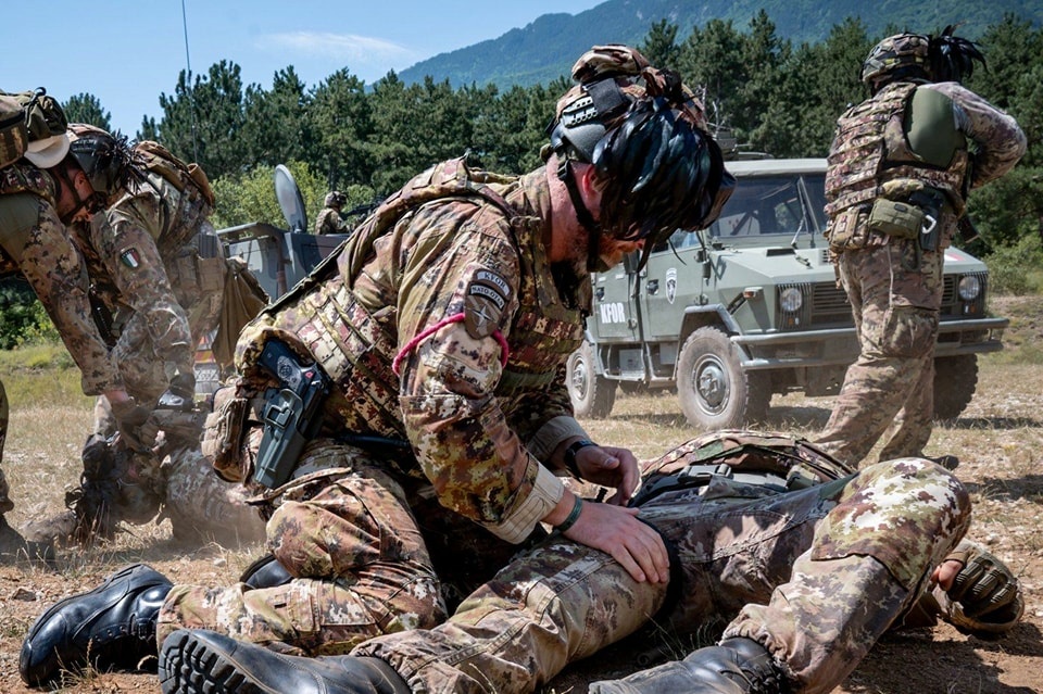 Sot, ushtarët nga Komanda Rajonale në perëndim të misionit të KFOR-it të udhëhequr nga NATO kryen një stërvitje të viktimave masive në kampin ‘Villaggio Italia’ në Pejё.
