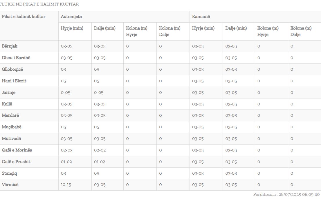 Qendra Kombëtare për Menaxhimin Kufitar në përditësimin e fundit të të dhënave ka bërë të ditur se përveç në Vërmicë që zgjasin pritjet deri në 15 minuta, në pikat e tjera kufitare qytetarët presin deri në 5 minuta.