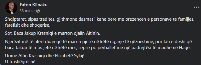 Klinaku përmes një postimi në facebook, shkroi se Jakup Krasniqi nuk mund të ishte në këte mes, sepse po përballet me një padrejtësi të madhe në Hagë. /arbresh.info/
