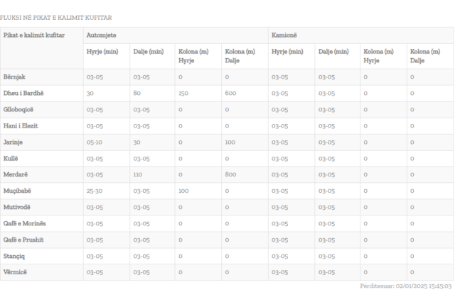 Sipas të dhënave të fundit, mërgimtarët po presin deri në një orë te pika kufitare Dheu i Bardhë, ku në dalje kolona është 600 metra. Gjithashtu pritje ka edhe në hyrje të kësaj pike, me një kolonë prej 150 metra.