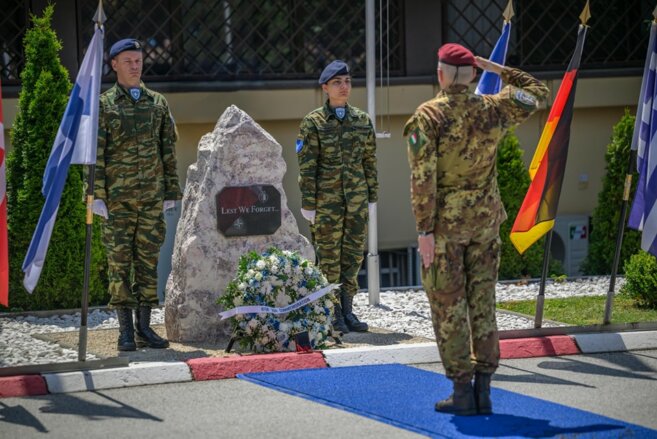 Ceremonia u hap nga Komandanti i KFOR-it, Gjeneral Major Enrico Barduani, me vendosjen e një kurore në monumentin e të Rënëve, në nderim të atyre që kanë humbur jetën gjatë shërbimit.