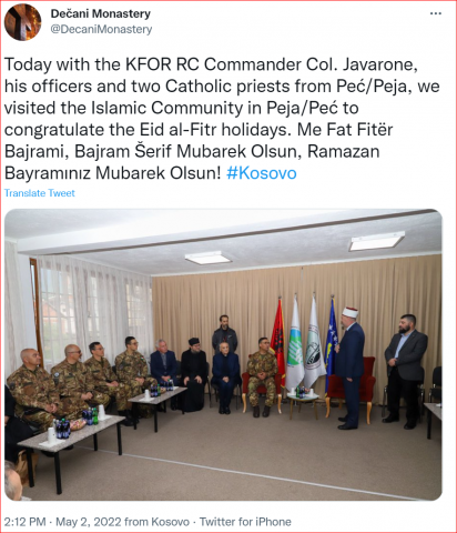 “Sot bashkë me Komandantin Rajonal të KFOR Col Javarone, oficerët e tij dhe dy priftërinj katolikë nga Peja vizituam Komunitetin Islamik në Pejë për t’i uruar për festat e Eid al -Fitr. Me Fat Fitër Bajrami, Bajram Šerif Mubarek Olsun, Ramazan Bayramınız Mubarek Olsun! #Kosovo” thuhet në urimin e Manastirit të Deçanit në Twitter.
