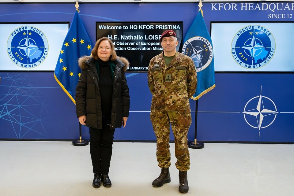 Komandanti i misionit paqeruajtës të NATO-s në Kosovë, KFOR, gjeneralmajor Enrico Barduani, ka pritur sot në takim shefen vëzhguese të Misionit të BE-së, Nathalie Loiseau, me të cilën ka diskutuar mbi sigurinë, situatën e stabilitetit rajonal dhe përpjekjet e EOM-it në mbështetjen e zgjedhjeve transparente dhe demokratike në Kosovë.