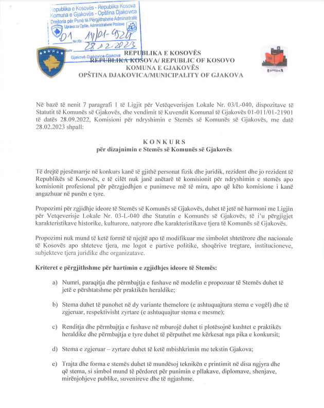 Komuna e Gjakovës ka shpallur konkurs për dizajnimin e stemës së kësaj komune.