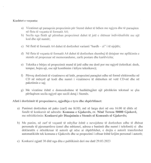 Në konkursin e shpallur nga kjo komunë thuhet se të drejtë pjesëmarrje në këtë konkurs kanë të gjithë personat fizik dhe juridik, rezident dhe jo rezident të Republikës së Kosovës, të cilët nuk janë anëtarë të komisionit për ndryshimin e skemës apo komisionit profesional për përzgjedhjen e punimeve më të mira, apo këto komisione i kanë angazhuar në punën e tyre.