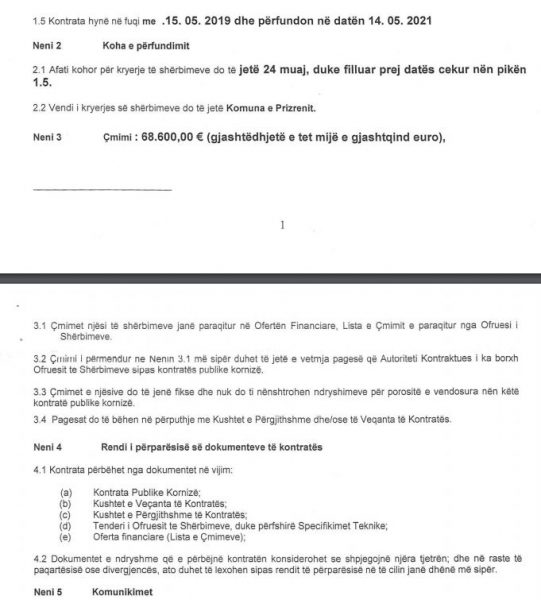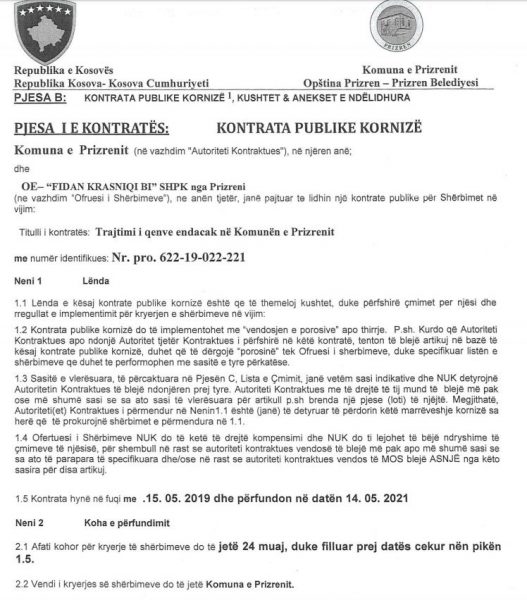 Kontrata do t’i kushtoj Komunës së Prizrenit 68 mijë e 600 euro. Bëhet fjalë për një kontratë 24 muajshe dhe nis nga 15 maj deri me 14 maj të vitit 2021.