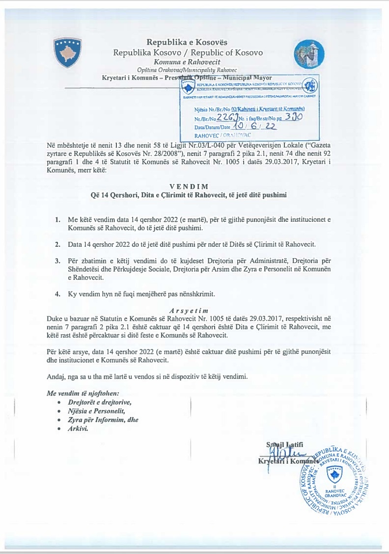 “Në mbështetje të nenit 13 dhe nenit 58 të Ligjit Nr. 03/L-040 për Vetëqeverisjen Lokale (“Gazeta zyrtare e Republikës së Kosovës, Nr. 28/2008”), Vendimin e Kuvendit të Komunës së Rahovecit për themelimin e çmimit “Ukshin Hoti” me 01 Nr. 292/22 të datës 30.03.2022, nenit 74 dhe nenit 92 paragrafi 1 dhe 4 të Statutit të Komunës së Rahovecit Nr. 1005 i datës 29.03.2017, Kryetari i Komunës, merr Vendim që 14 Qershori, Dita e Çlirimit të Rahovecit, të jetë ditë pushimi”, thuhet në njoftimin nga Komuna e Rahovecit./arbresh.info/