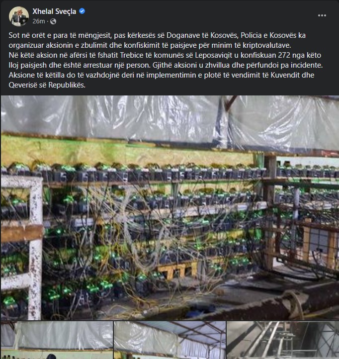 Sveçla përmes një postimi në Facebook, ka bërë të ditur se nga ky aksion në fshatin Trebice të komunës së Leposaviqit janë konfiskuar 272 pajisje të kriptovalutave dhe është arrestuar një person.