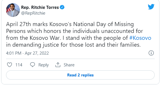 Kongresisti amerikan, Ritchie Torres, thotë se është krah popullit kosovar për të kërkuar drejtësi për të zhdukurit dhe familjet e tyre, shkruan arbresh.info.