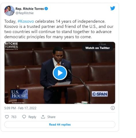 Kongresmeni demokrat Ritchie Torres ka uruar 14 vjetorin e pavarësisë me një fjalim të shkurtër që ka mbajtur në Dhomën e Përfaqësuesve.