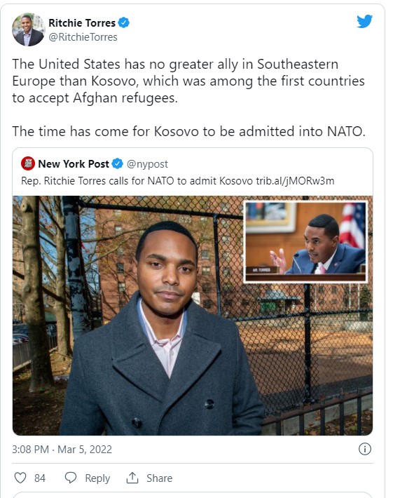 “Shtetet e Bashkuara nuk kanë aleat më të madh në Evropën Juglindore se Kosova, e cila ishte ndër vendet e para që pranoi refugjatët afganë. Ka ardhur koha që Kosova të pranohet në NATO”, shkruan Torres.