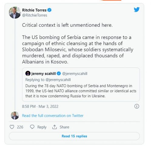 Në Twitter, Torres duke i replikuar gazetarit Scahill, tha se bombardimi i Serbisë nga SHBA-ja ka ardhur pasi në Kosovë bëhej spastrim etnik nga Slobodan Millosheviqi, në atë kohë.