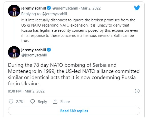 Në një shkrim në Twitter, Scahill e quan situatë të ngjashme, agresionin rus ndaj popullatës ukrainese me ndërhyrjen dhe bombardimin e Serbisë nga SHBA në Kosovë.