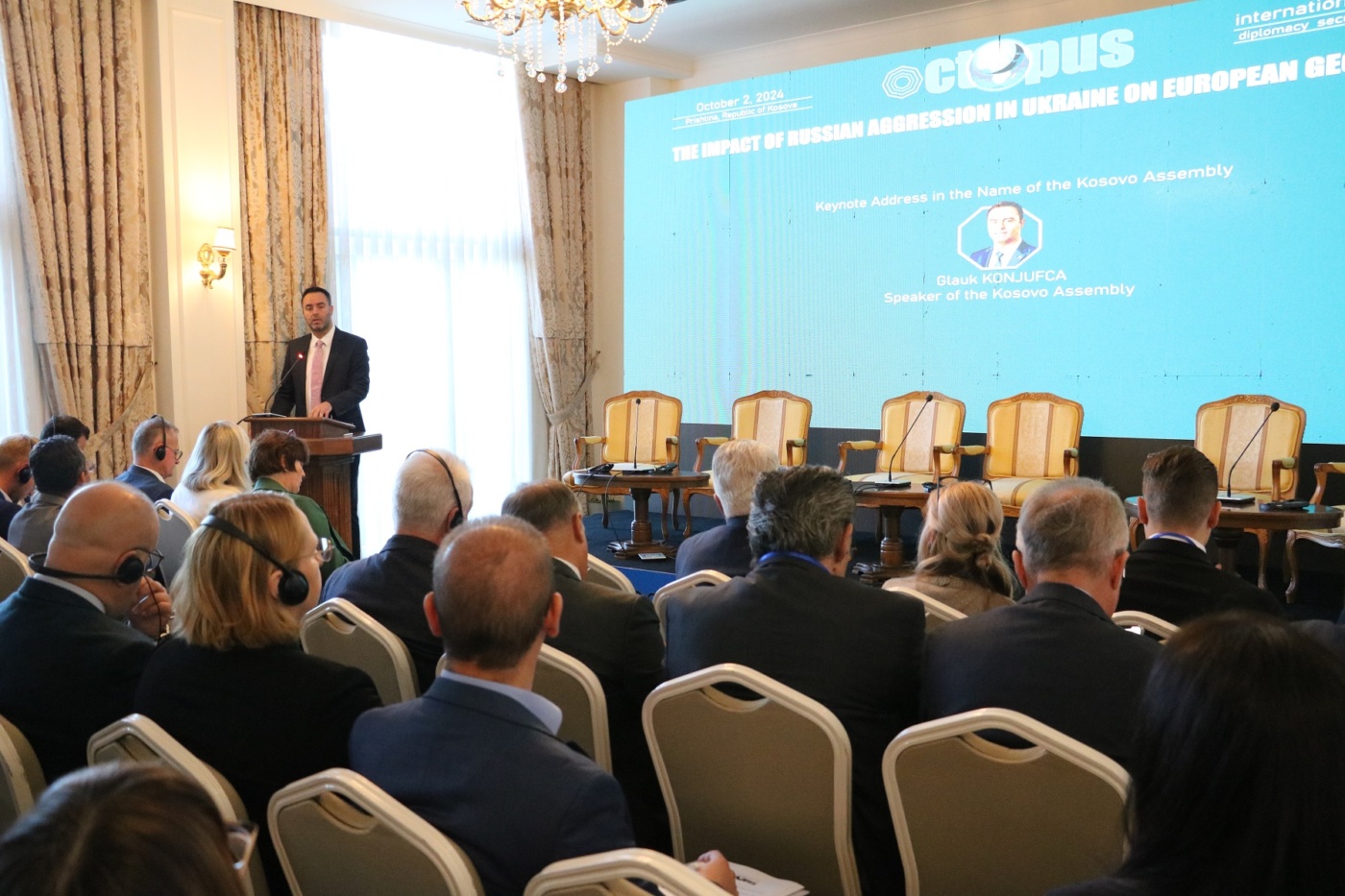 Kryetari i Kuvendit të Republikës së Kosovës, Glauk Konjufca, mori pjesë dhe mbajti fjalim në konferencën “Impakti i agresionit rus në Rusi dhe në gjeopolitikën evropiane”, organizuar sot në Prishtinë nga Instituti për Studime të Luftës Hibride, OCTOPUS.