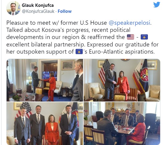 “Kënaqësi të takohem me ish-përfaqësuesen e Dhomave të ShBA-së, Nancy Pelosi. Biseduam për progresin e Kosovës, zhvillimet e fundit politike në rajonin tonë dhe rikonfirmuam partneritetin e shkëlqyer dypalësh. Shprehim mirënjohjen tonë për mbështetjen e saj të hapur përaspiratat euro-atlantike të Kosovës” , ka shkruar Konjufca në Twitter./arbresh.info/