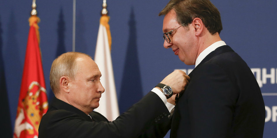 17.01.2019, Serbien, Belgrad: Wladimir Putin (l), Präsident von Russland, verleiht Aleksandar Vucic, Präsident von Serbien, nach ihren Gesprächen den russischen Alexander-Newski-Orden. Im Mittelpunkt der Visite Putins stehen unter anderen der Anschluss Serbiens an die geplante Gaspipeline Turkish Stream, die Gas aus Russland über die Türkei nach Europa bringen soll, sowie Waffenverkäufe Russlands an Serbien. Foto: Darko Vojinovic/AP/dpa +++ dpa-Bildfunk +++