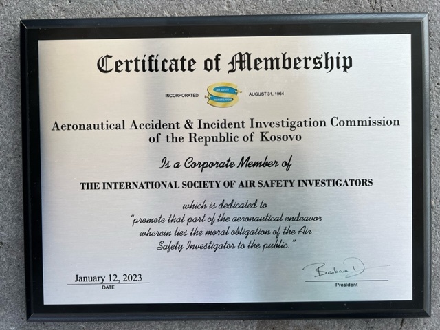 Në mbledhjen e Bordit të ISASI të mbajtur me 12 janar 2023 KHAIA që përfaqëson Republikën e Kosovës në fushën e Hetimeve të Aksidenteve Ajrore ishte pranuar Corporate Member of ISASI dhe gjatë zhvillimeve të punimeve të mbledhjes vjetore të “The International Society of Air Safety Investigators (ISASI)” që po mbahet në Nashville, Tennessee në ShBA në një ceremoni zyrtare është ndarë pllaka e pranimit nga Kryetarja e “The International Society of Air Safety Investigators”, znj. Barbara Dunn.