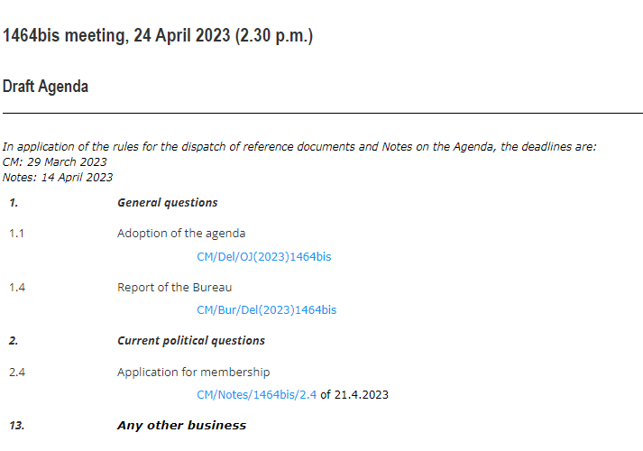 Në agjendën e publikuar në faqen zyrtare të KiE-së, figuron si pikë 2.4 “aplikimi për anëtarësim” i një shteti.