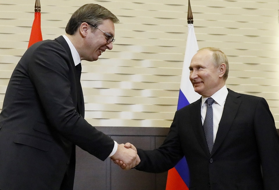 KK26 Soèi - Ruský prezident Vladimir Putin (vpravo) a srbský prezident Aleksandar Vuèiè poèas stretnutia v Soèi 4. decembra 2019. FOTO TASR/AP Russian President Vladimir Putin shakes hands with his Serbian President Aleksandar Vucic in the Bocharov Ruchei residence in the Black Sea resort of in Sochi, Russia, Wednesday, Dec. 4, 2019. (Shamil Zhumatov, Pool Photo via AP)