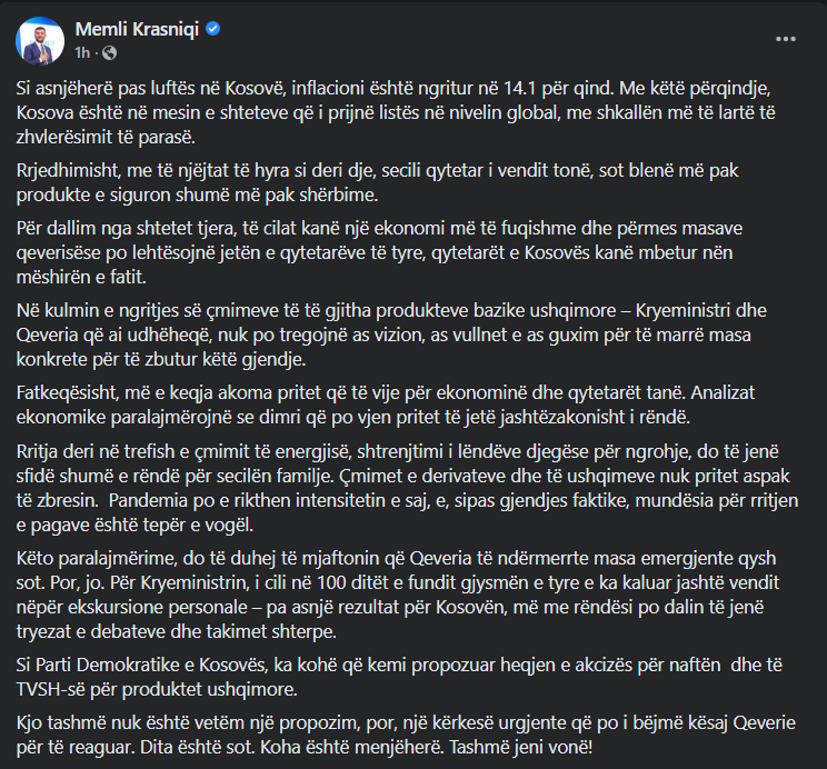 Në një postim në Facebook, Krasniqi ka rikujtuar që si asnjëherë pas luftës në Kosovë, inflacioni është ngritur në 14.1 për qind dhe qytetarët po e përjetojnë rëndë këtë punë.