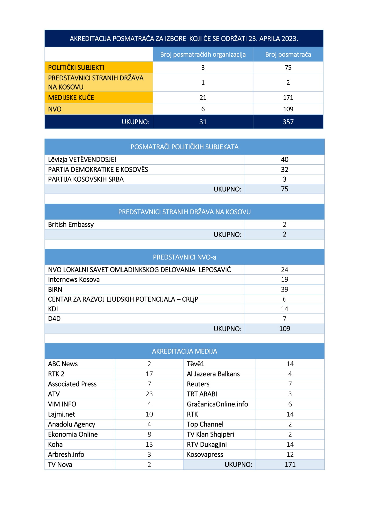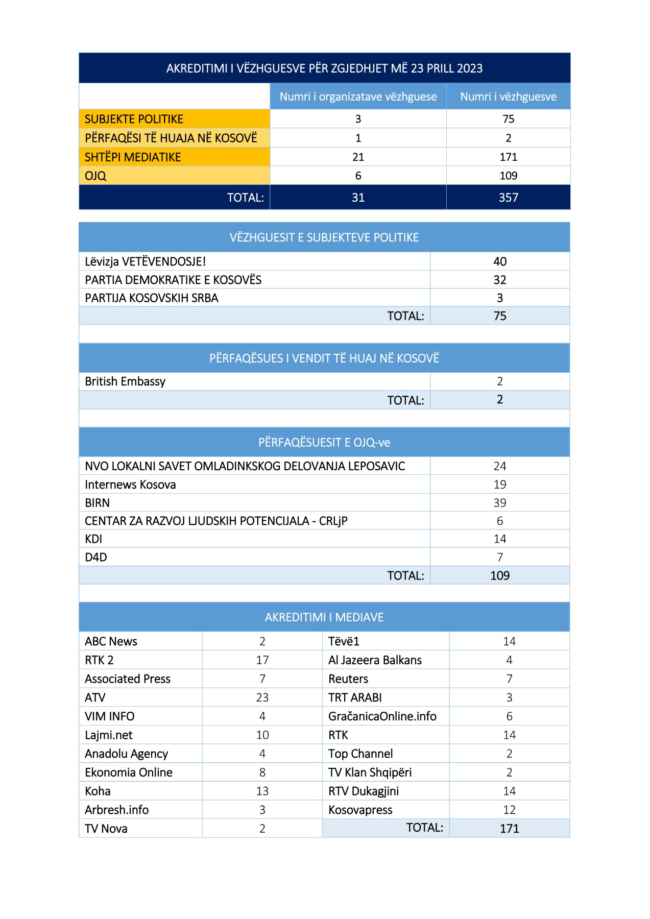 Përmes një komunikate për media bëhet e ditur se të akredituar janë 357 vëzhgues duke përfshirë subjektet politike, përfaqësi të huaja në Kosovë, shtëpi mediave dhe organizata joqeveritare, përcjell Arbresh.info.