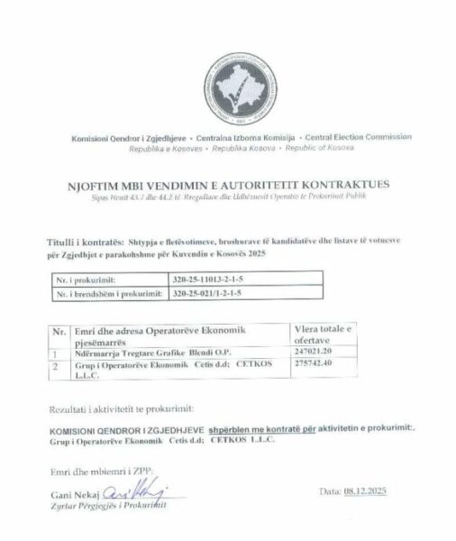 Sipas njoftimit për dhënie të kontratës, që figuron në faqen “e-prokurimi”, vlera e kontratës është mbi 275 mijë euro.
