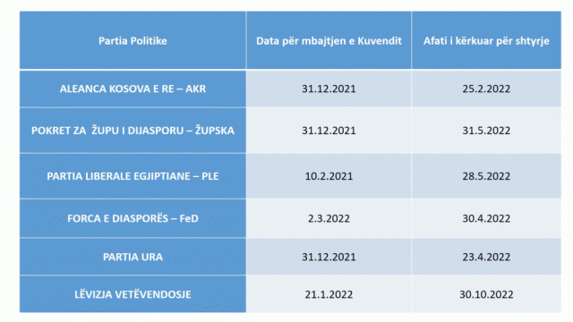 Në njoftim thuhet se në vitin 2022 janë planifikuar të mbahen 14 kuvende zgjedhore të partive politike, por për shkak të gjendjes pandemike dhe masave kufizuese për tubimet, Zyra ka pranuar disa kërkesa për shtyrjen e afateve për mbajtjen e tyre.