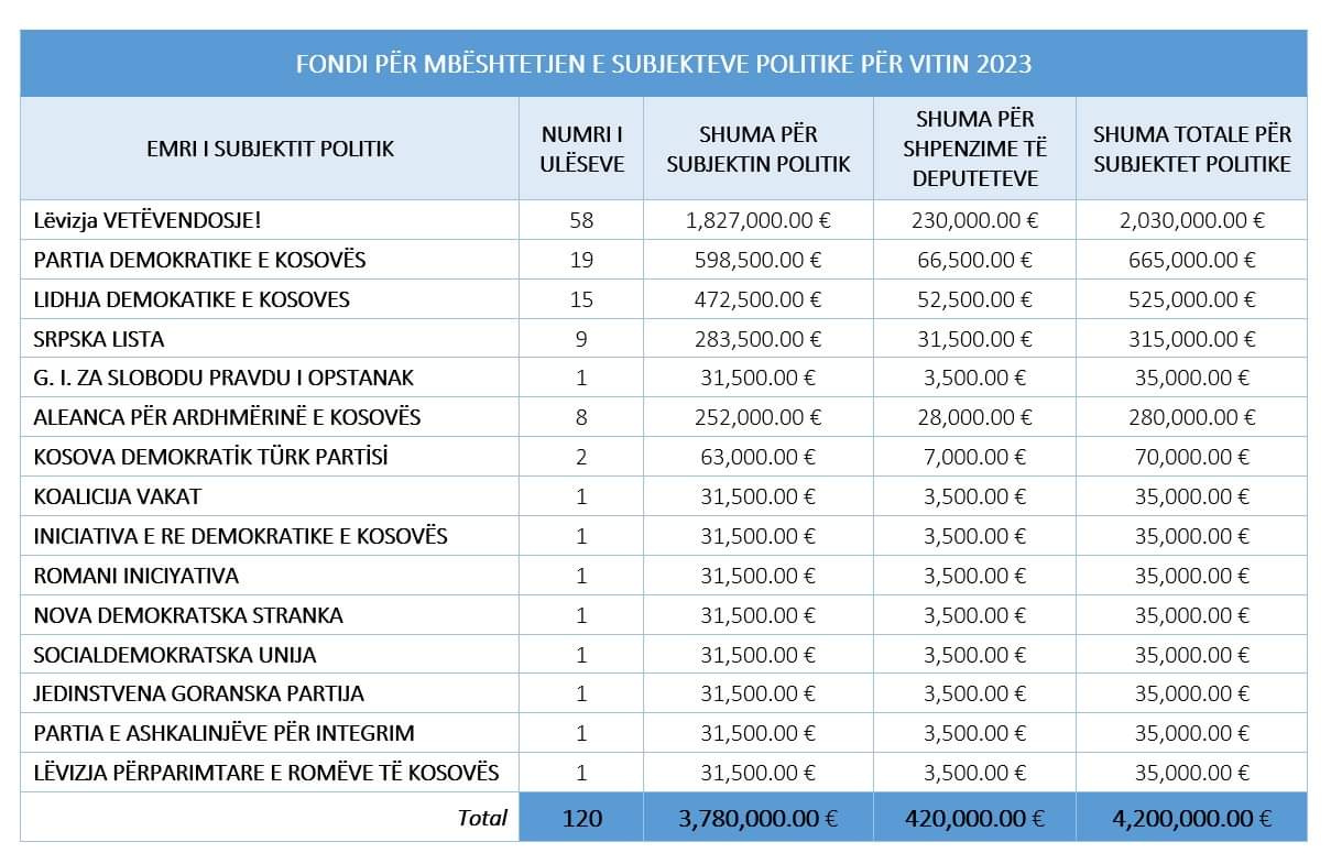 Në bazë të tabelës ku shihet se sa do të përfitojnë të gjitha subjektet brenda Kuvendit të Kosovës nga subjektet politike të komuniteteve joshumicë, më së shumti do të përfitojë Lista Serbe me 9 deputetë, 315 mijë euro.