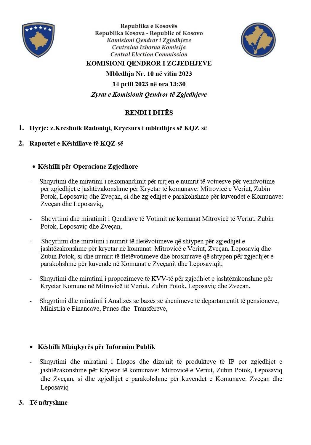 “Ju njoftoj se mbledhja e radhës e Komisionit Qendror të Zgjedhjeve mbahet të premten, më 14 prill, me fillim në orën 13:30. Në rend të ditës është planifikuar që nga anëtarët e KQZ-së të shqyrtohen dhe miratohen disa çështje në kuadër të përgatitjes së zgjedhjeve të 23 prillit”, tha ai.