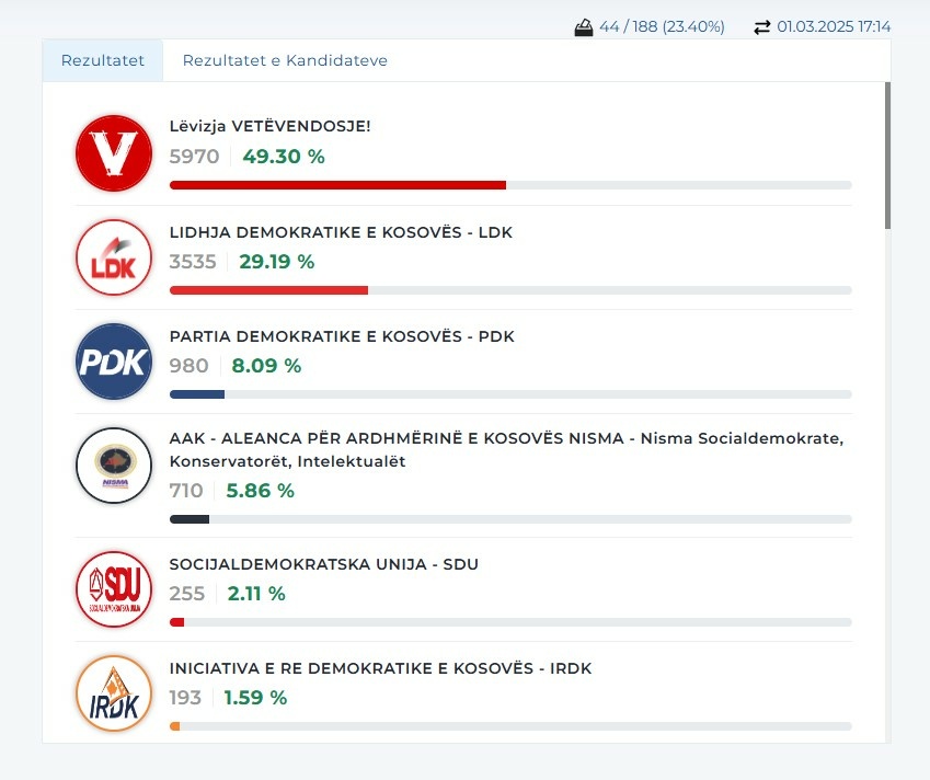 Sipas të dhënave më të fundit të publikuara më 1 mars 2025 në orën 17:14, janë numëruar 44 nga 188 kuti votimi, ose 23.40% e totalit.
