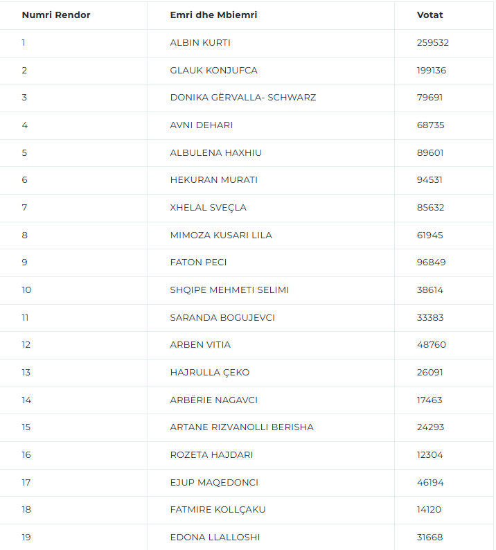 Kandidati për kryeministër i Lëvizjes Vetëvendosje (LVV), Albin Kurti, ka marrë numrin më të madh të votave nga lista e VV-së, me gjithsej 259,532 vota. Pas tij, në vendin e dytë si më i votuari nga lista e LVV-së ka dalë Glauk Konjufca, me 199,136 vota, ndërsa në vendin e tretë është Faton Peci, me 96,849 vota.