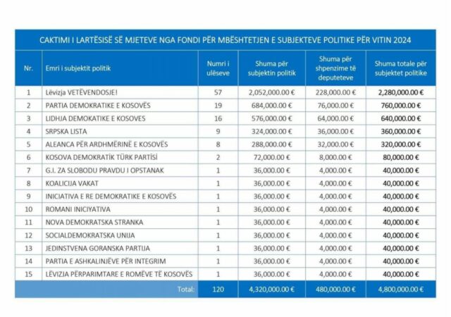 Shuma e mjeteve për financimin e subjekteve politike dhe për mbështetjen e punës së secilit deputet nga ky fond është në vlerën e përgjithshme, 4 milion e 800 mijë euro.